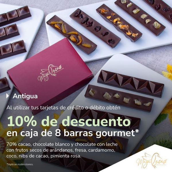 10% de descuento en caja de 8 barras gourmet. 70% cacao, chocolate blanco y chocolate con leche con frutos secos de arándanos, fresa, cardamomo, coco, nibs de cacao, pimienta rosa. Válido al 30 de marzo 2026.