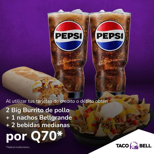 2 Big Burrito de Pollo+1 Nachos Bellgrande+2 Bebidas Medianas por Q70 precio normal Q110*