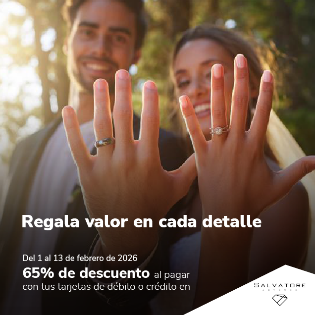 Promoción válida del 1 al 13 de febrero de 2026. Recibe65% de descuento al pagar con tus tarjetas débito o crédito de St. Georges Bank. No aplica en relojes, platería, ni con otras promociones o descuentos. Piezas de oro liso se venden por peso. Solicita el beneficio de Cuotas Promerica hasta 18 meses al 0% de interés llamando al call center 270-5000, a más tardar tres (3) días antes de su fecha de corte del estado de cuenta. Aplica cargo administrativo y cargo por póliza de deuda sobre saldo. No participan las tarjetas de crédito regionales ni corporativas. Cuotas Promerica va ligado al límite de crédito del cliente, no es un extrafinanciamiento. Tarjetas débito no aplican a traslado a cuotas. El Banco se reserva el derecho de modificar características y beneficios ofertados en este arte. La responsabilidad del Banco se limita exclusivamente a aspectos propios del crédito otorgado a través de la tarjeta de crédito y no por los productos o servicios adquiridos mediante el uso de la tarjeta.