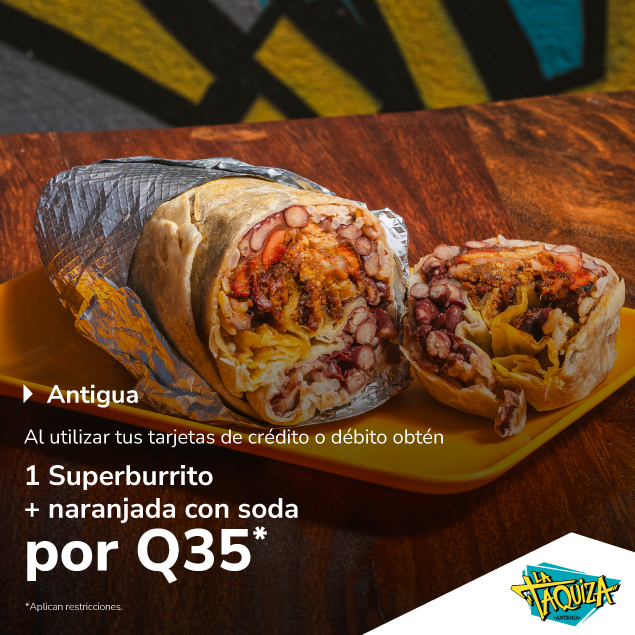 Ubicados en 3a calle Poniente 38b, Antigua Guatemala. 1 Superburrito + naranjada con soda por Q35. Válido al 31 de diciembre 2026.