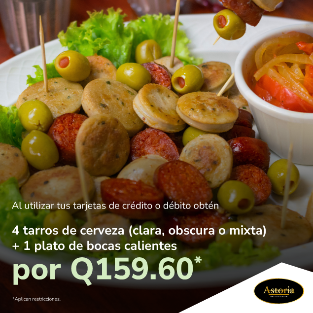4 tarros de cerveza (clara, obscura o mixta) + plato de boca calientes por Q159.60