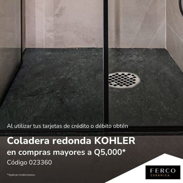 Coladera redonda KOHLER código 023360 en compras mayores a Q5,000. Válido al 31 de julio 2026.