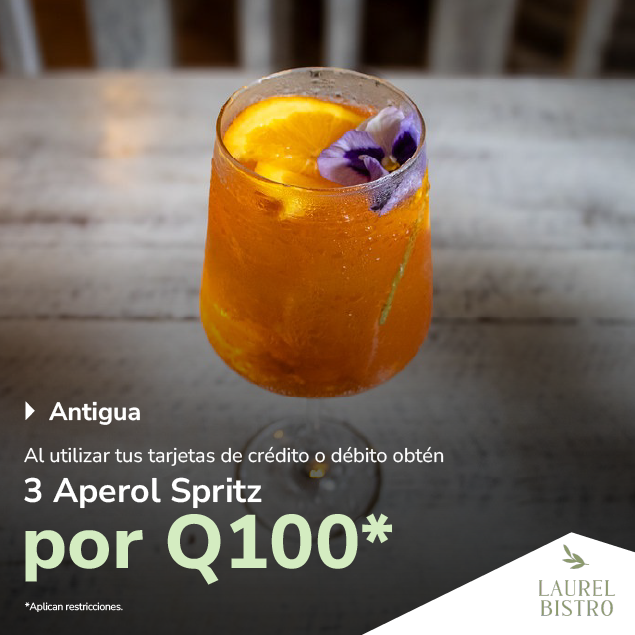 3 Aperol Spritz por Q100 Válido al 31 de diciembre 2026.