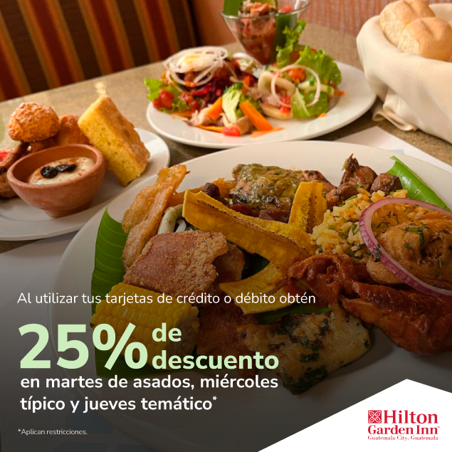 Precio regular: Q199.00 + 10% de servicio por persona.Horario de almuerzo: 12:00 pm a 3:00 pm. Incluyen una bebida natural y 1 hora de parqueo de cortesía. Previa reservación al 2423-0950.En los Jueves Temáticos, el buffet varía según temporada (ej. Buffet Temático de Verano). El cliente puede consultar la opción vigente llamando al 2423-0950.