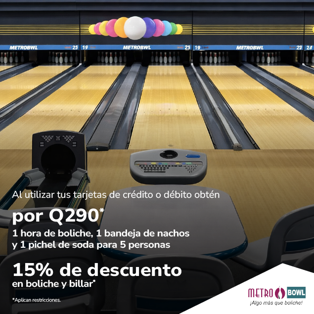1 hora de boliche, 1 bandeja de nachos y 1 pichel de soda para 5 personas por Q270 o 15% de descuento en boliche y billar. Válido al 31 de diciembre 2026. No aplica con otras promociones o descuentos.