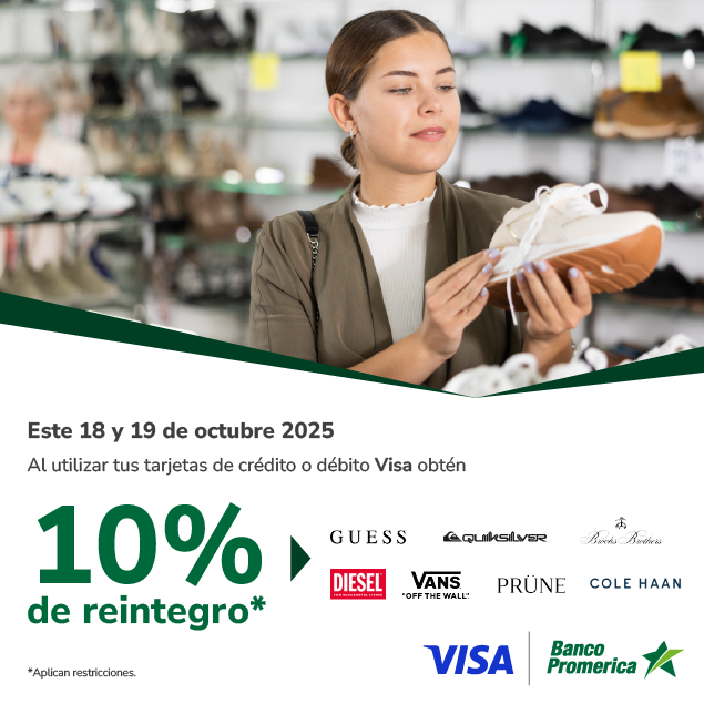 Al utilizar tus tarjetas de crédito o débito VISA obtén 10% de reintegro en Guess, Quiksilver, Brooks Brothers, Diesel, Vans, Prune y Cole Haan el 18 y 19 de octubre de 2025.