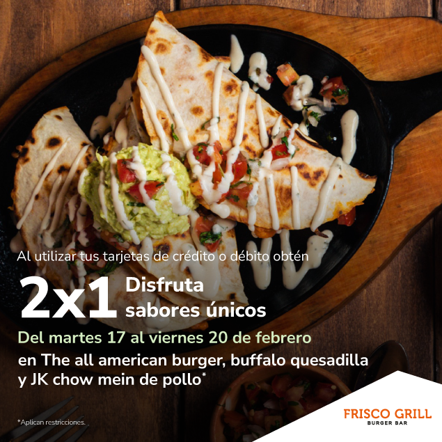 2x1 en The all american burger, buffalo quesadilla y JK chow mein de pollo.