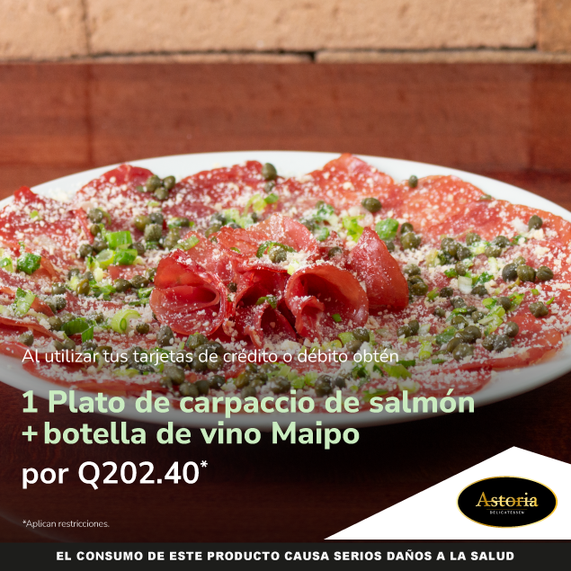 1 plato de carpaccio de salmón + botella de vino Maipo por Q202.40. Válido al 30 de junio 2026.